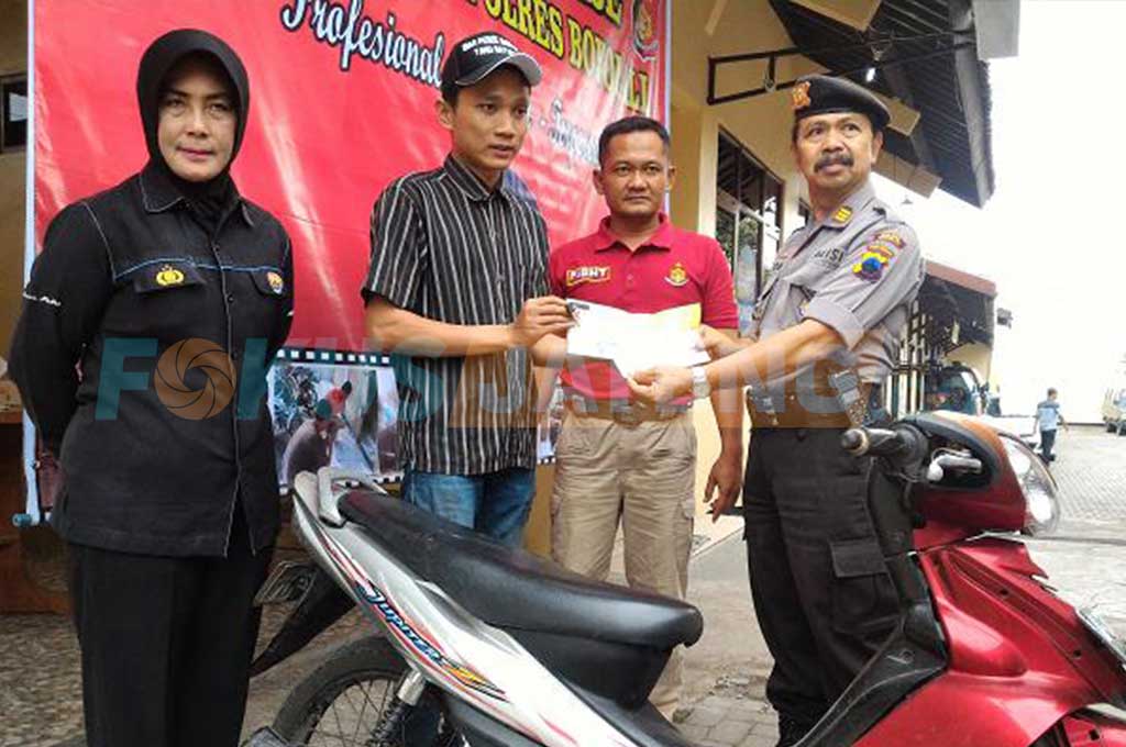 Kapolsek Andong AKP Suwardiyono didampingi Kasatreskrim Polres Boyolali AKP Miftakul Huda menyerahkan motor milik Tri Jatmiko, Rabu 19 Juli 2017. | Yulianto
