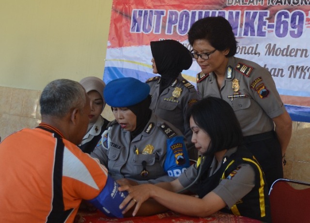 Karanganyar – Polwan Polres Karanganyar menggelar bhakti sosial berupa pengobatan gratis dan bagi sembako untuk memperingati Hari Jadi ke-69 Polwan di Halaman Januraga Mapolres Karanganyar, Jumat (11/8/2017) siang. (FokusJateng/Suroto)