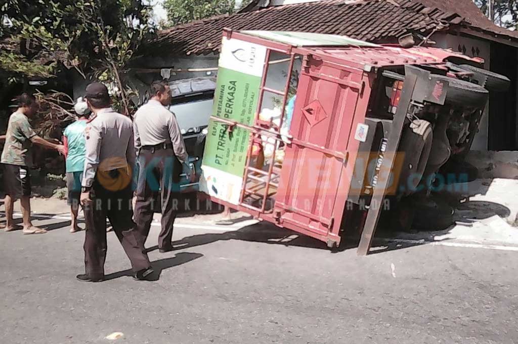 Kecelakaan yang melibatkan truk gas elpiji 3 kg dengan Honda CR-V pecah di simpang empat tanpa traffic light Kampung Driyan, Kelurahan Siswodipuran, Boyolali Kota, Jawa Tengah, Senin 10 Juli 2017. Kondisi truk terguling menyeruduk teras rumah warga. Sedangkan mobil Honda CR-V masuk bahu jalan dan menyeruduk teras rumah warga. (nto)