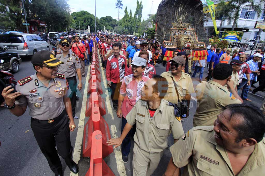 FOKUS JATENG – SOLO – Usai berorasi di Bundaran Gladak, Jalan Slamet Riyadi, Solo, ratusan sopir taksi yang tergabung dalam ”Barisan Antiangkutan Ilegal” longmarch menuju balaikota. Mereka beraudensi dengan Wali Kota Solo F.X. Hadi Rudyatmo, Selasa siang 11 Juli 2017.