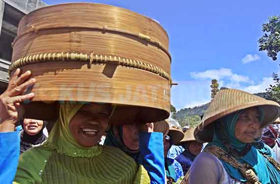 Warga membawa hasil bumi di ritual Tungguk Tembakau Desa Senden, Kecamatan Selo, Boyolali, Kamis 3 Agustus 2017. | Ichwan Prihantoro