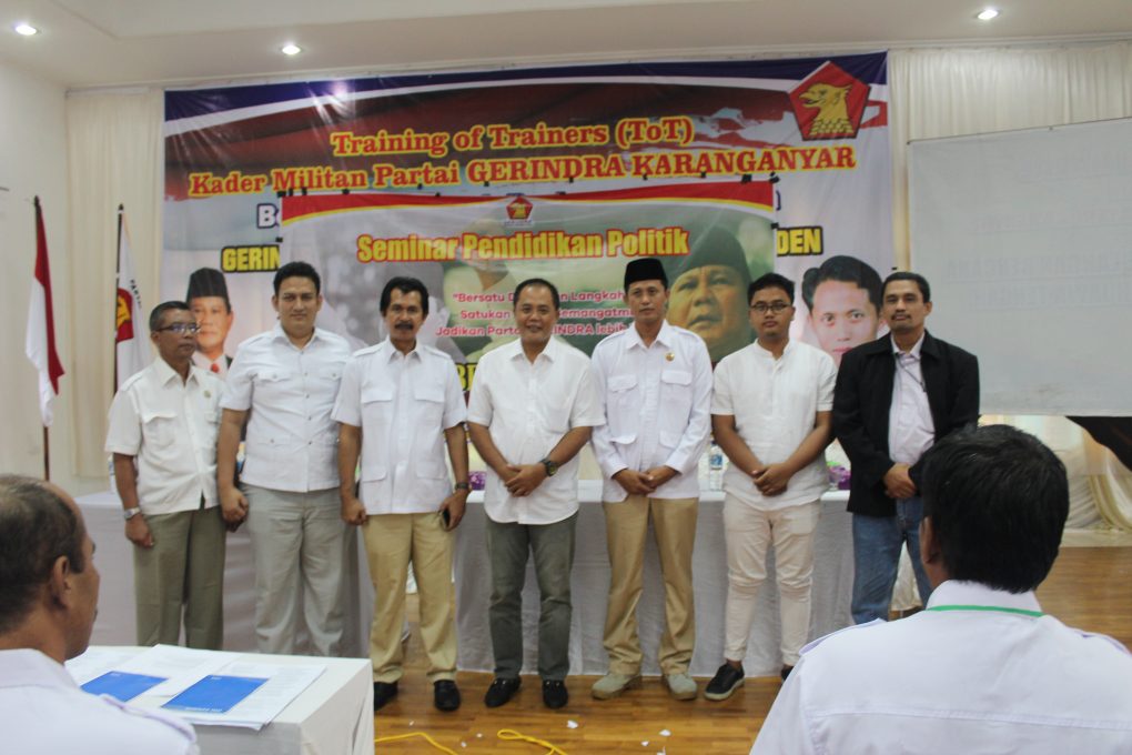 Acara pelatihan kader militan DPC partai Gerindra tersebut diikuti kurang lebih dua ratusan orang di Gedung Sanusi Muhammadiyah Tawangmangu Karanganyar.” Partai berharap para kader yang kita didik ini nantinya menjadi ujung tombak dalam helatan politik di karanganyar “ kata ketua DPC Gerindra Karanganyar Yulianto. Acara tersebut juga dihadiri Bupati Karanganyar Juliatmono yang juga calon bupati periode 2018 – 2023 dari partai Golkar.