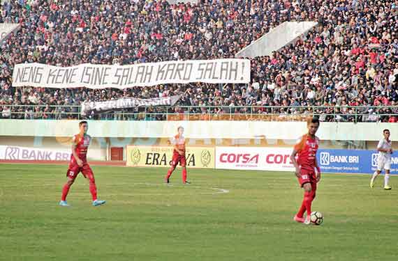 Sebelum meninggalkan Stadion yang berkapasitas 23 ribu penonton tersebut, suporter Persis di tribun B6 membentangkan sebuah spanduk bertuliskan “Neng Kene Isine Salah Karo Salah !”. Tulisan tersebut seperti penggalan dari lirik lagu Suket Teki yang dipopulerkan Didi Kempot. Di lain sisi juga terdapat sebuah spanduk bertuliskan “Terimakasih”, serta terdapat dua sosok wajah di sana.