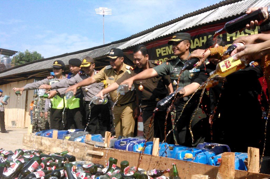 Mereka kompak memberantas pekat dengan pemusnahan minuman keras (miras) berbagai merek Senin 19 Juni 2017.