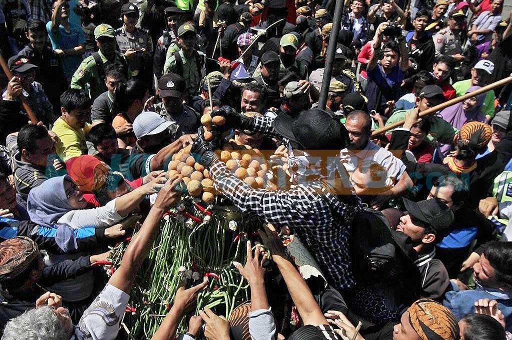 Setelah sampai Masjid Agung, gunungan tersebut didoakan sesepuh masjid. Usai didoakan gunungan jaler yang berisi sayur, telur asin, dan gorengan bulat – seperti klenyem – jadi rebutan warga yang sengaja datang untuk ngalap berkah. Sedangkan gunungan wadon yang berisi rengginang diarak kembali ke kraton. Setiba di halaman kraton, gunungan wadon tersebut juga jadi rebutan warga. (ich)