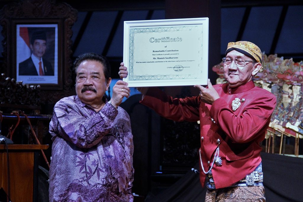 FOKUS JATENG – SOLO – Dalang kondang Ki Mantep Soedharsono nyadong penghargaan dari Union Internasionale de le Marionnette Internasional Pupperty Association (UNIMA). Penghargaan tersebut diterima secara langsung di Pendapa ISI Solo, Senin malam 3 Juli 2017. Penyerahan oleh Presiden UNIMA Indonesia Samudra Wijaya.
