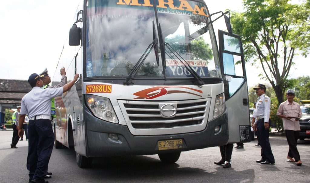 FOKUS JATENG – SRAGEN – Petugas Dinas Perhubungan (Dishub) Sragen menjaring sekitar 50 bus di dua terminal di Sragen, Selasa 4 Juli 2017. Bus tersebut merupakan angkutan penumpang selama arus balik Lebaran. Pengecekan tersebut di terminal Gemolong dan Pilangsari.