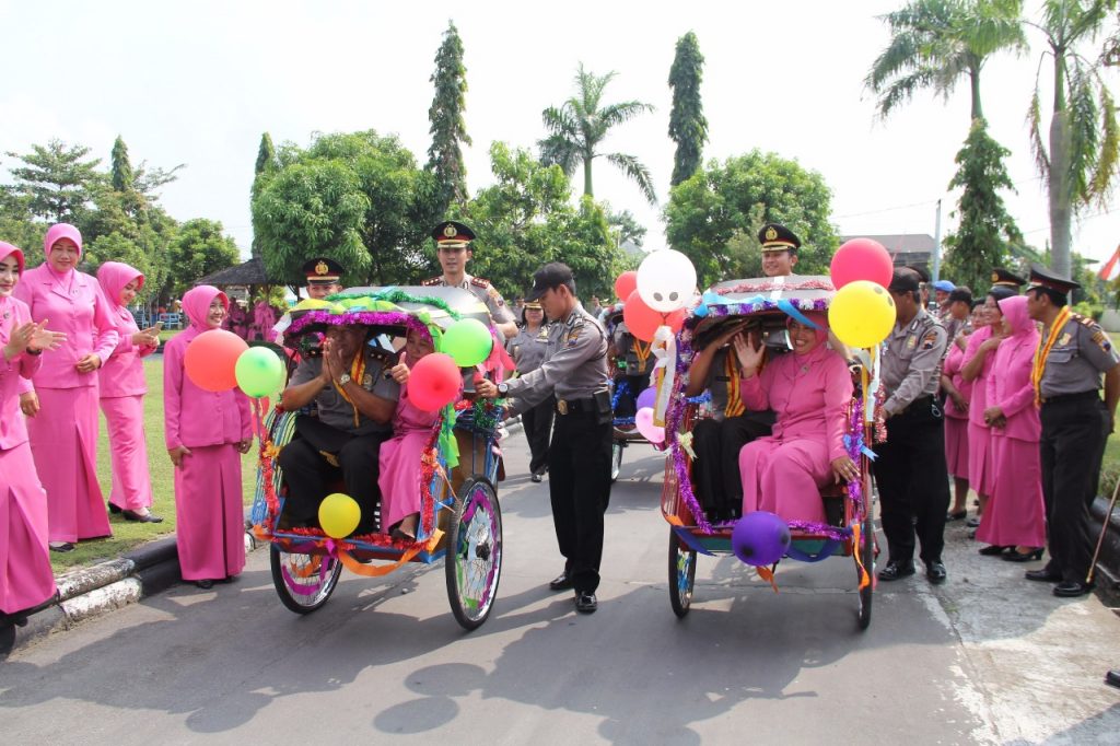 FOKUS JATENG – KLATEN – Wisuda Purnawirawan Polri yang digelar Polres Klaten terkesan istimewa Selasa 4 Juli 2017. Sebab, 32 personel diarak menggunakan becak serta diberi hiasan.