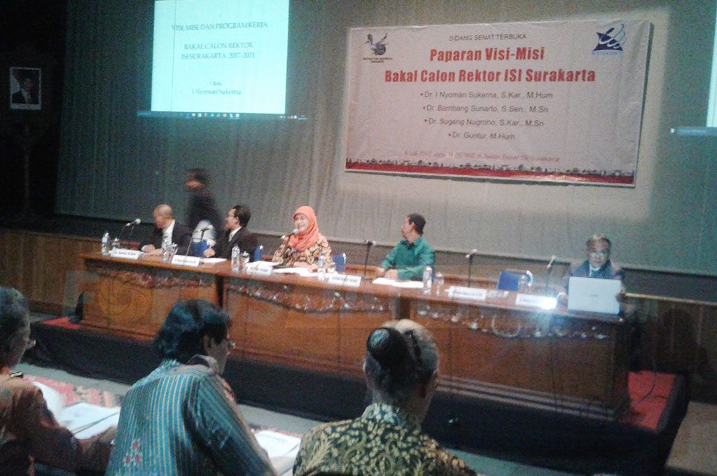 FOKUS JATENG – SOLO – Pemilihan rektor Institut Seni Indonesia (ISI) Surakarta diikuti empat bakal calon (balon). Mereka pada Selasa 4 Juli 2017 beradu visi dan misi di Teater Besar kampus setempat. Mereka yakni Dr. I Nyoman Sukerna, S.Kar, M.Hum, Dr. Sugeng Nugroho, S.Kar, M.Sn, Dr. Bambang Sunarto, S.Sen, M.Sn, dan Dr. Guntur, M.Hum.