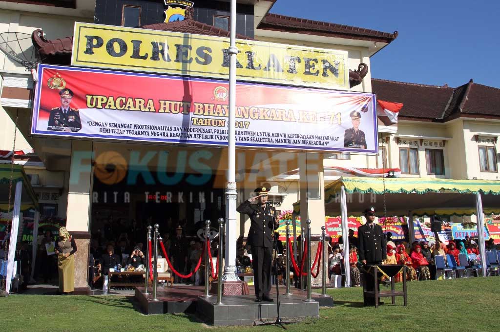 FOKUS JATENG – KLATEN – Dengan semangat profesional dan moderisasi, Polri berkomitmen untuk meraih kepercayaan masyarakat demi tetap tegaknya Negara Kesatuan Republik Indonesia (NKRI) yang sejahtera, mandiri dan keberadilan. Hal itu diungkapkan, Kapolres Klaten AKBP Muhammad Darwis saat memimpin ucapara HUT Bhayangkara ke-71 di halaman mapolres setempat, Senin 10 Juli 2017 pagi.