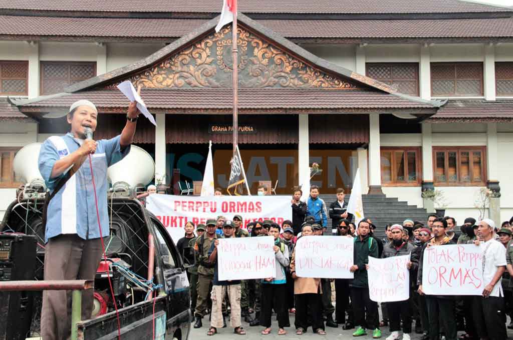 Dengan berbekal spanduk dan poster bertuliskan penolakan terhadap Perppu Ormas, mereka menggelar orasi selama sekitar satu jam lebih. Tak hanya itu, mereka juga mengajak para wakil rakyat untuk menolak Perppu tersebut karena dinilai sebagai bentuk kediktaktoran penguasa dan melanggar HAM serta berpotensi menjadi peraturan subversif yang bisa mematikan ormas, khususnya ormas Islam.
