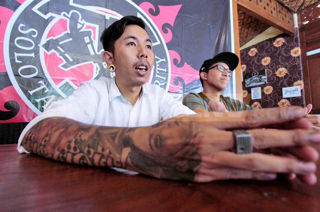 Dika ketua panitia Solo Skin Art Exhibition #3 memberikan keterangan pers di wedangan de Thamrin , Gremet, Manahan, Solo, Selasa 18 Juli 2017 terkait even Solo Tato Festival yang akan digelar tanggal 25 Juli hingga 27 Juli 2017 di Taman Budaya JawaTengah Surakarta. | Ichwan Prihantoro