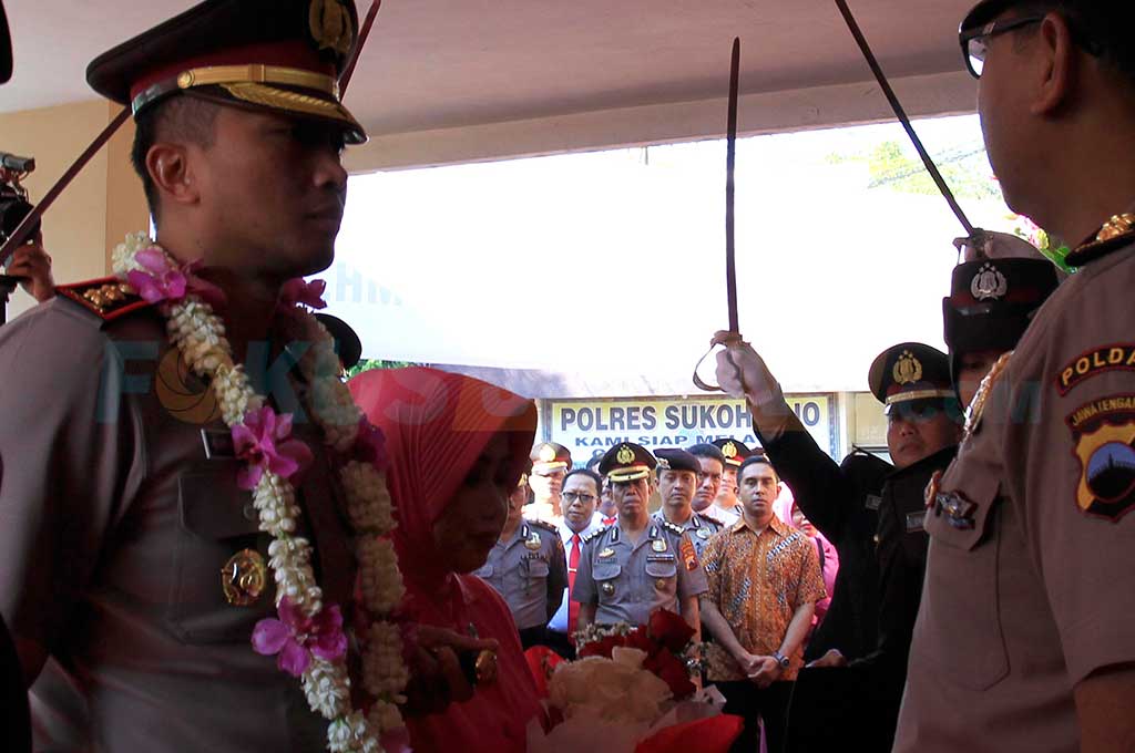 Kapolres Sukoharjo AKBP Iwan Saktiadi beserta isteri mendapat karangan bunga dan disambut upacara tradisi Pedang Pora oleh anggota. | Susilo