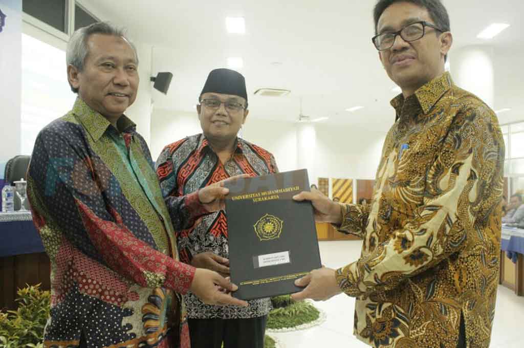 Penyerahan Surat Keputusan (SK) AIPT dilakukan oleh Direktur Penjamin Mutu Ristekdikti Prof. Aris Junaidi, PhD kepada Rektor UMS Dr. Sofyan Anief, MSi di Gedung Induk Siti Walidah, Kampus UMS, Pabelan Kartasura, Sukoharjo, Sabtu 22 Juli 2017.