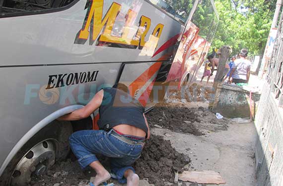 Berawal saat dirinya sedang duduk di depan rumah melihat bus tersebut melaju dan ingin menyalip pengguna jalan lain, namun bus malah ambles. ”Awalnya bus mau nyalip dengan kecepatan kencang,” kata dia.