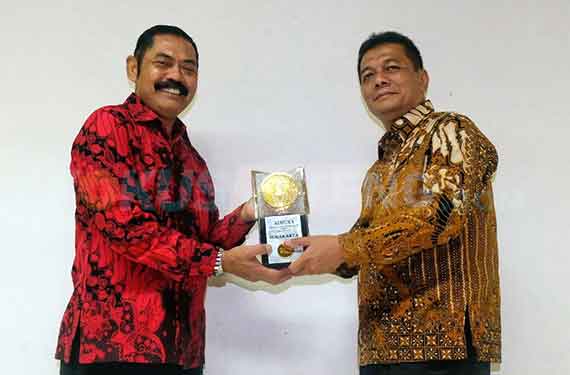 Wali Kota Solo F.X. Hadi Rudyatmo (batik merah) bersama Kepala Dinas Lingkungan Hidup Solo Hasta Gunawan memegang piala adipura yang berhasil dipertahankan tahun ini. | Putranti
