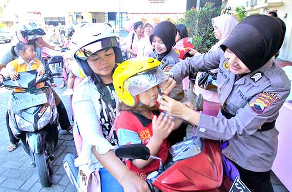Dan bukan hanya orang dewasa atau orang tua saja yang mengenakan helm saat berkendara dengan sepeda motor, tapi anak-anak juga harus tertib berlalu lintas dengan memakai helm, Terang istri Wakapolres Sukoharjo Kompol M. Ifan Hariyat.