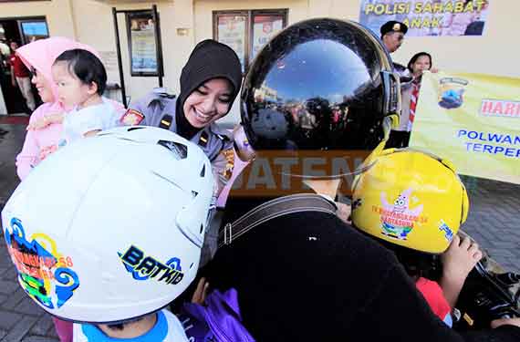 klik. Polwan menyematkan helm gratis untuk anak-anak di Mapolsek Kartasura, Sukoharjo, Senin pagi 14 Agustus 2017. (Ichwan Prihantoro/Fokus Jateng)