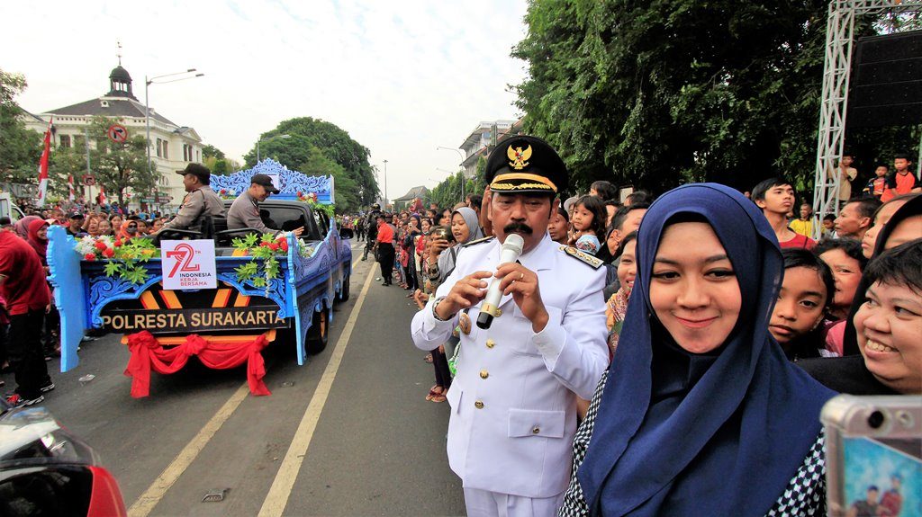 Walikota Solo di antara banyaknya warga yang hendak menyaksikan Pawai Pembangunan di Solo, Jumat (18/8/2017) sore. (FokusJateng/Ichwan Prihantoro)