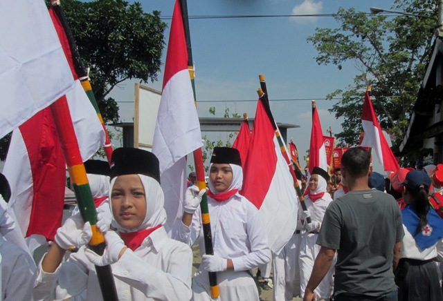 Para pelajar di Kecamatan Sumberlawang, Sragen meramaikan karnaval HUT Kemerdekaan Republik Indonesia ke-72, Jumat (18/8/2017) siang hingga menjelang sore. (FokusJateng/Huriyanto)