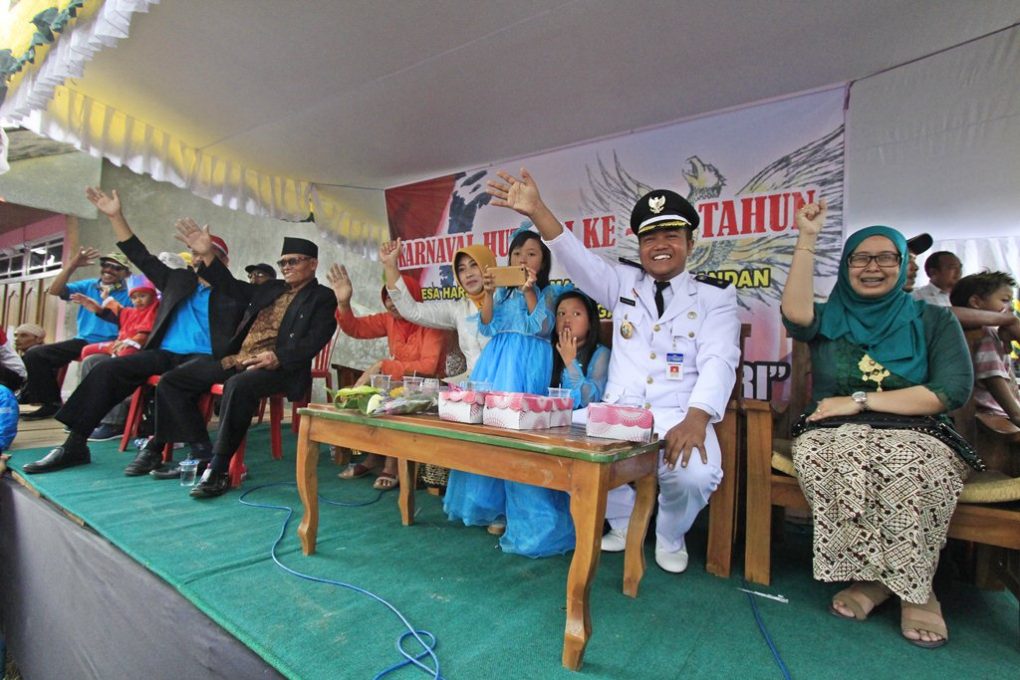 SENYUM PAK KADES –Kepala Desa Harjosari, Sutarso tersenyum sumringah, membalas sapaan para peserta karnaval HUT Kemerdekaan RI, Sabtu (19/8/2017). (FokusJateng/Ichwan Prihantoro)