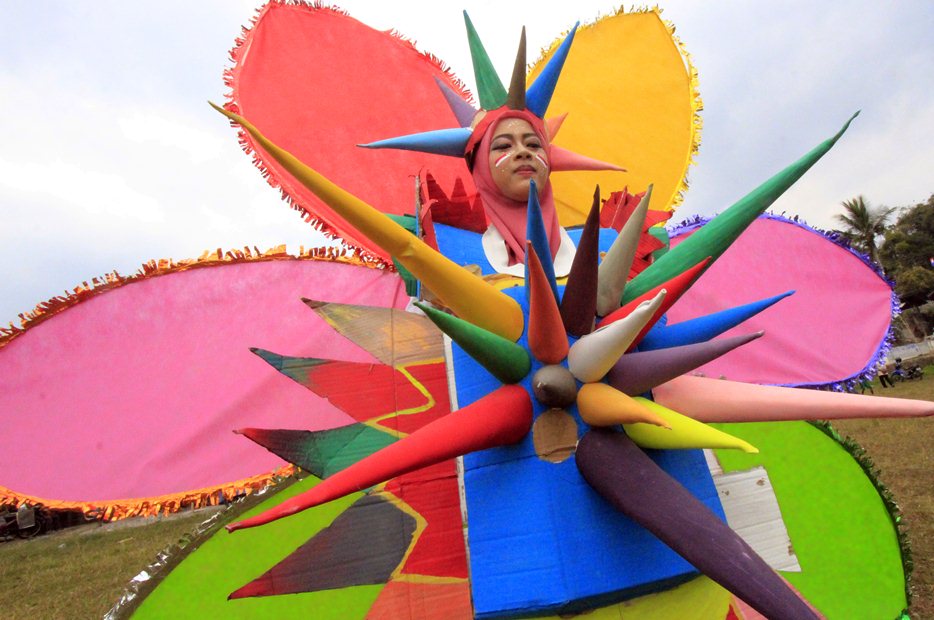 WANITA BERDURI FUNKY –Peserta berkostum penuh dengan duri di karnaval Desa Harjosari, Sabtu (19/8/2017)