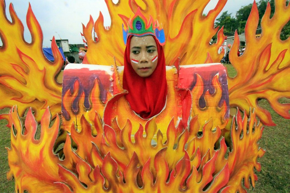 WANITA API ASMARA– Wanita api asmara ini memeriahkan karnaval di Harjosari, Sabtu (19/8/2017). (FokusJateng/Ichwan Prihantoro).