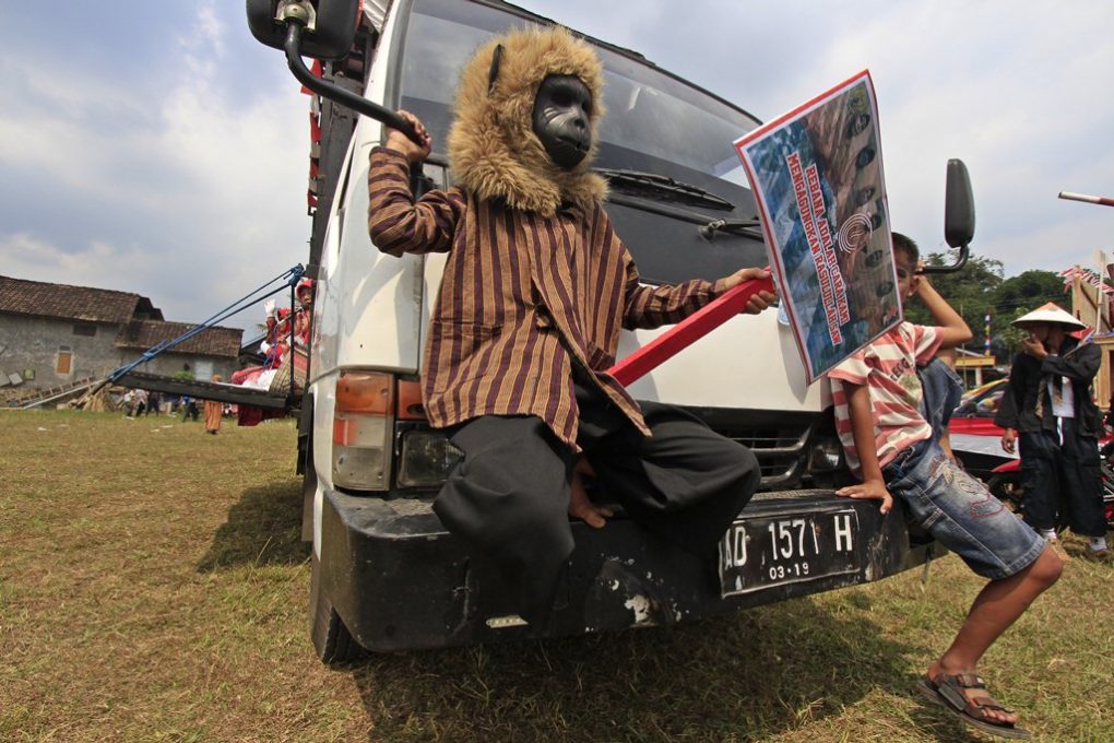 MONYET KERNET–Monyet pirang bergelantungan di spion truk hadrah. (FokusJateng/Ichwan Prihantoro)