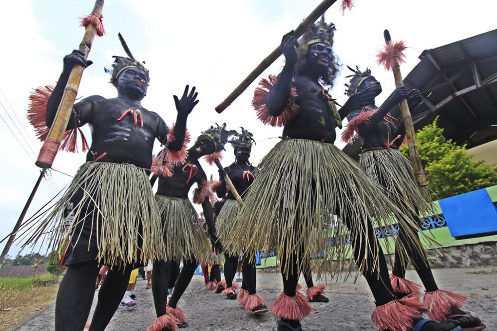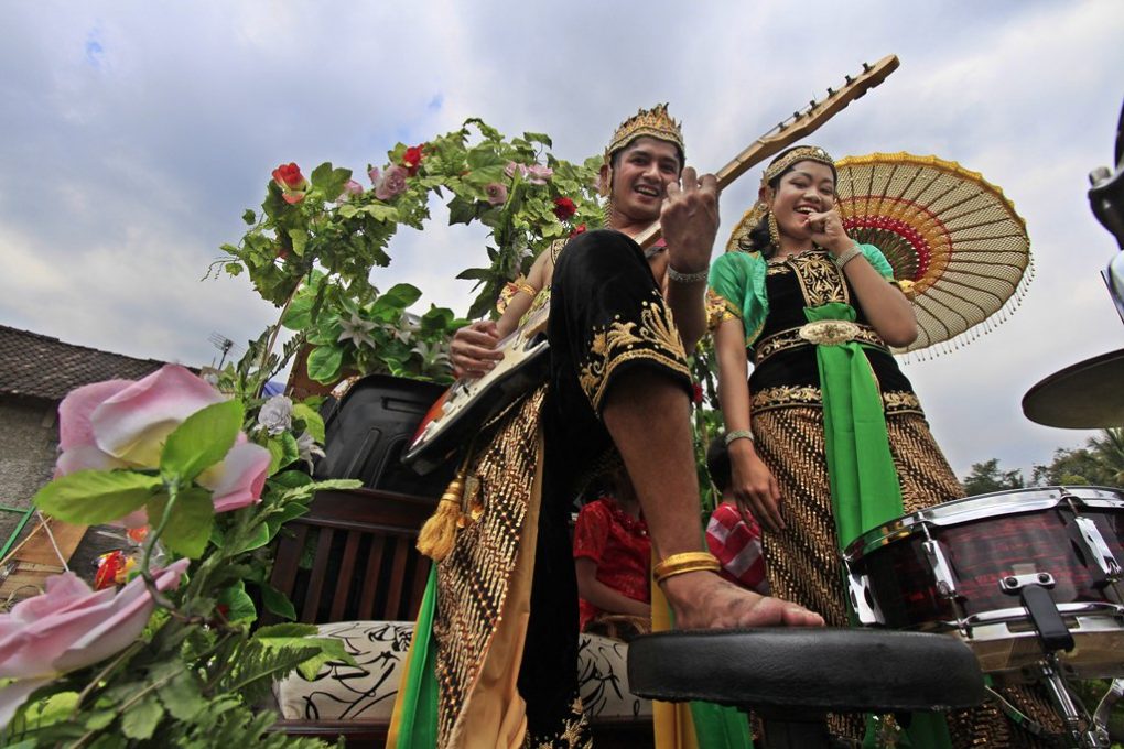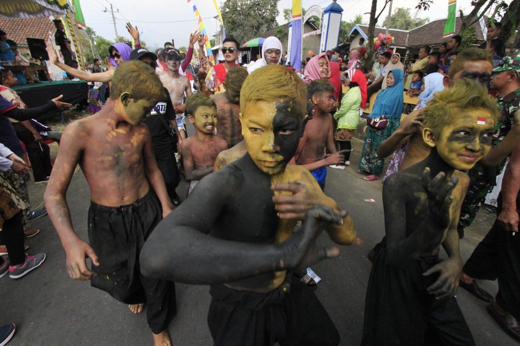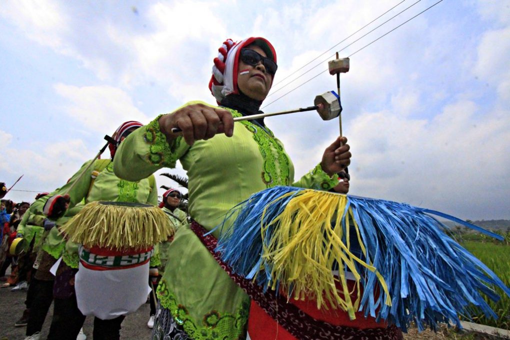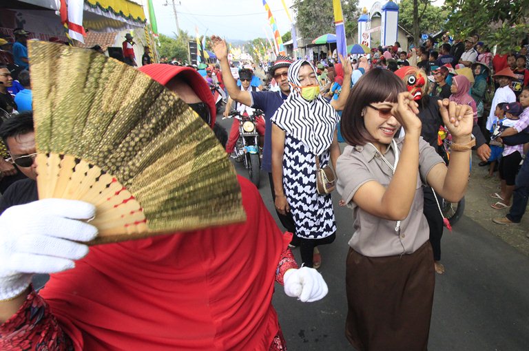 TARI BLONTHENG–Peserta karnaval HUT Kemerdekaan RI di Harjosari, Sabtu (19/8/2017). (FokusJateng/Ichwan Prihantoro)
