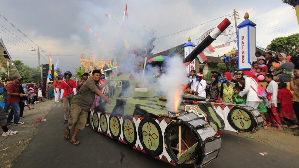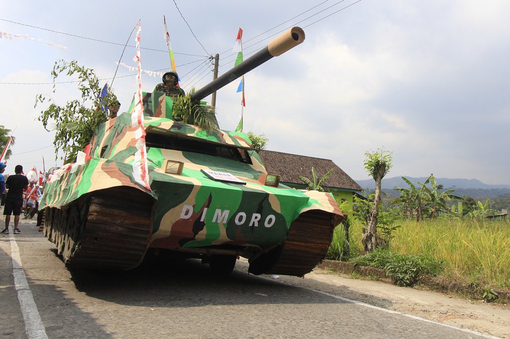 TANK MERCON LEOPARD — Warga Harjosari menampilkan replika tank saat Karnaval HUT Kemerdekaan RI, Sabtu (19/8/2017). (FokusJateng/Ichiwan Prihantoro)