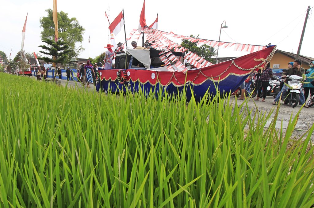 KAPAL DARAT MAMPIR SAWAH — Kreasi warga Harjosari, Karangpandan saat karnaval HUT RI, Sabtu (19/8/2017). (FokusJateng/ CIhwan Prihantoro)