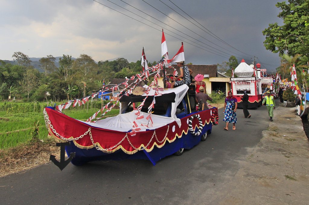 KAPAL DARAT– Kreasi warga Harjosari saat karnaval HUT Kemerdekaan RI, Sabtu (19/8/2017)
