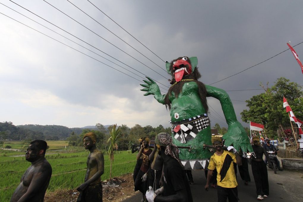OGOH OGOH BUTO IJO– Kreasi warga Harjosari saat karnaval HUT Kemerdekaan RI, Sabtu (19/8/2017). (FokusJateng/Ichwan Prihantoro)
