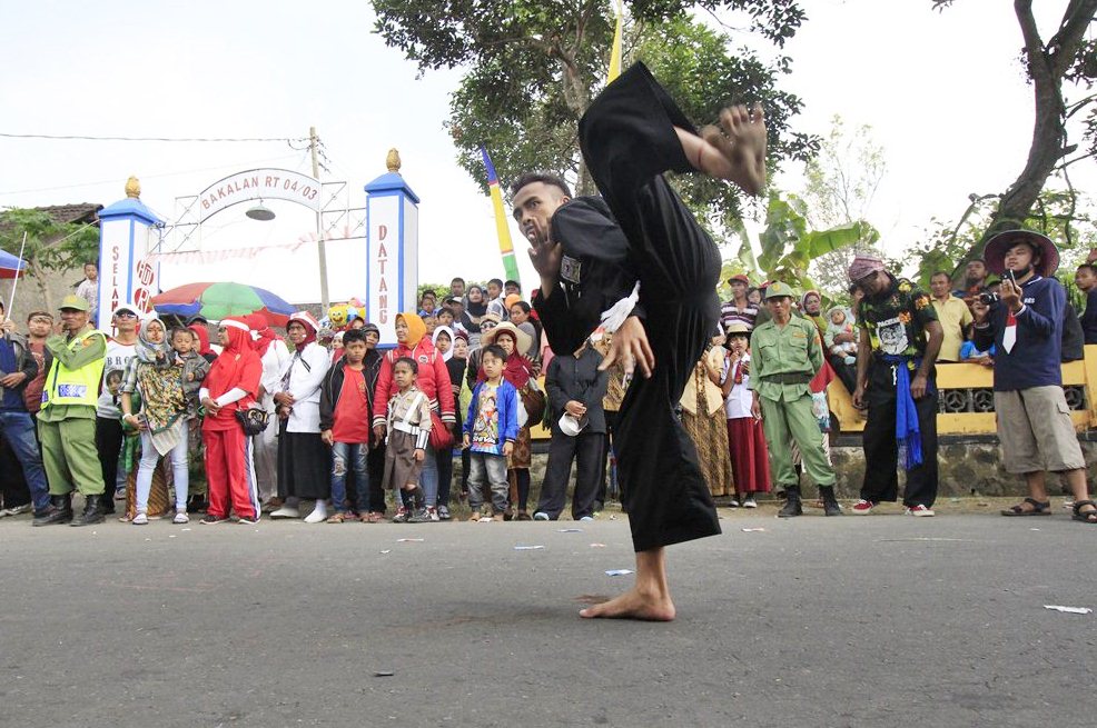 PENDEKAR LERENG LAWU — Aksi seorang pendekar SH Terate saat karnaval di Harjosari, Sabtu (19/8/2017). (FokusJateng/Ichwan Prihantoro)