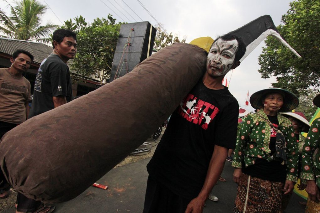 ARIT BUTO — Replika arit rakasasa ikut diarak saat karnaval di Harjosari, Sabtu (19/8/2017). (FokusJateng/Ichwan Prihantoro)