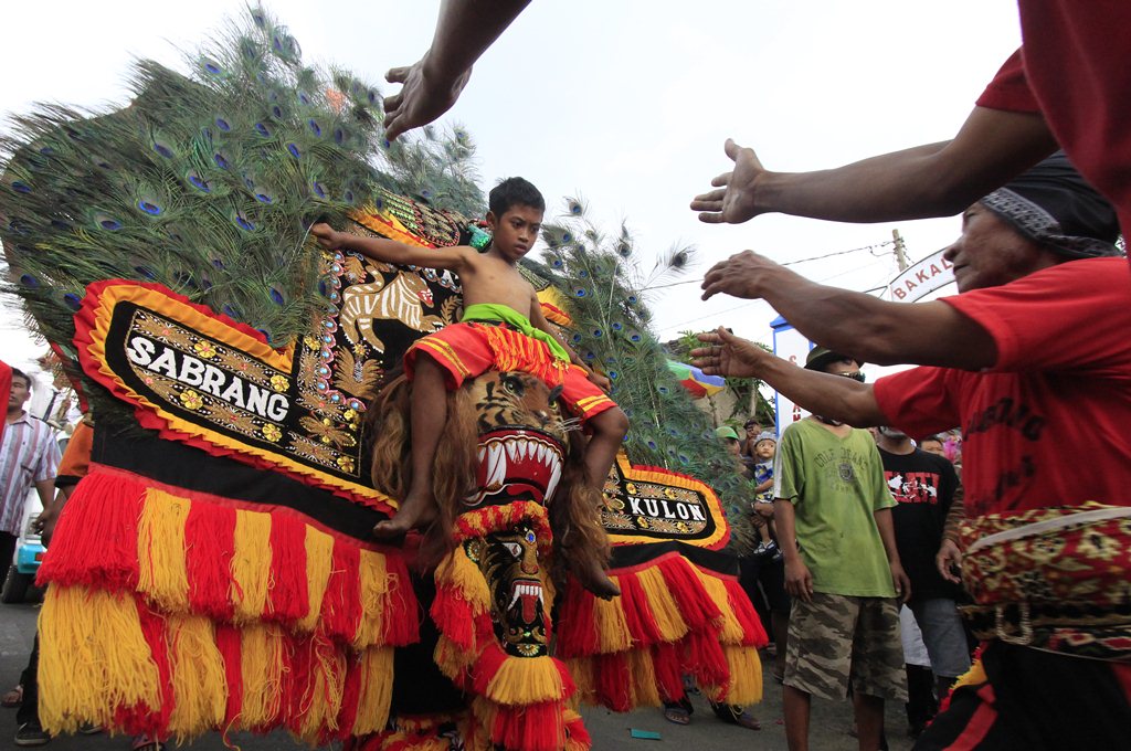 REOG BAIK HATI– Reog ini baik hati sekali, mau menggendong seorang bocah saat karnaval di desa Harjosari, Sabtu (19/8/2017). (FokusJateng/Ichwan Prihantoro)