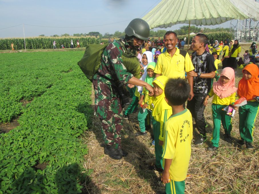 Prajurit Kopassus Grup II Kandang Menjangan akrab anak-anak usai mendarat sukses di Plupuh, Sragen, Rabu 23 Agustus 2017. (FokusJateng/Huriyanto)