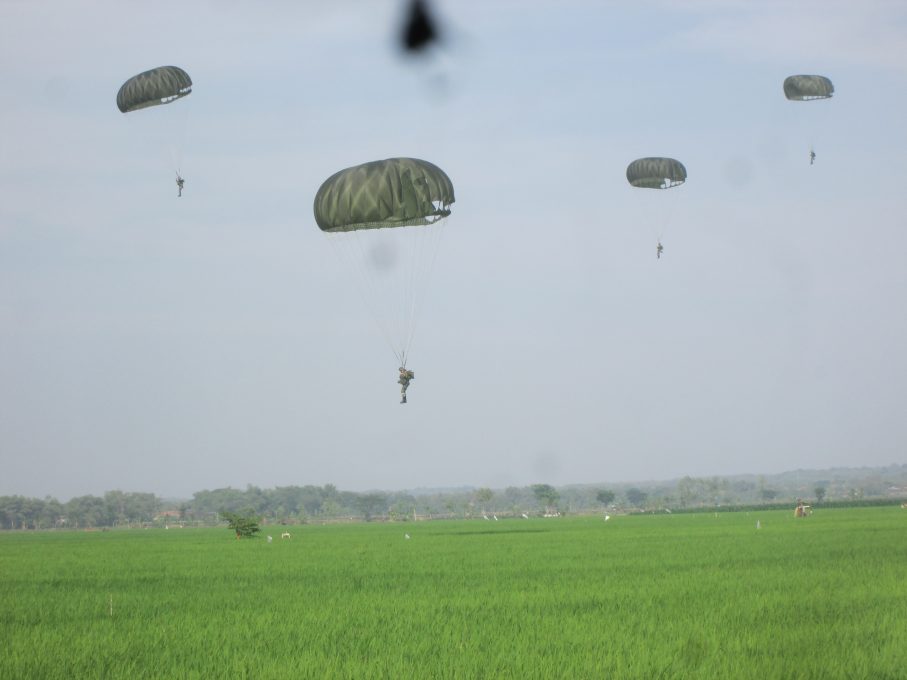 FOKUS JATENG – SRAGEN – Kopassus Grup II Kandang Menjangan Kartasura, Sukoharjo menggelar latihan terjun payung statik di Desa Karungan, Kecamatan Plupuh, Sragen, Rabu 23 Agustus 2017. Latihan kali ini melibatkan 160 prajurit.