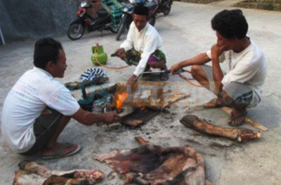 Warga Tanon. Sragen menikmati daging hewan kurban yang dibagikan rombongan Masjid Al Karim Kajen, Danukusuman, Solo yang dipimpin H Shamsuri saat pembagian daging hewan kurban.