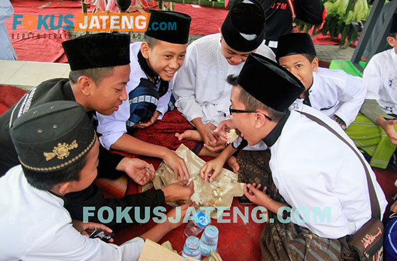 Para santri menyantap makanan dari gunungan kirab Ki Ageng Singoprono di Gunung Tugel, Nglembu, Sambi, Boyolali, Minggu (10/9/2017). (credit-Ichwan-Prihantoro/Fokusjateng.com)