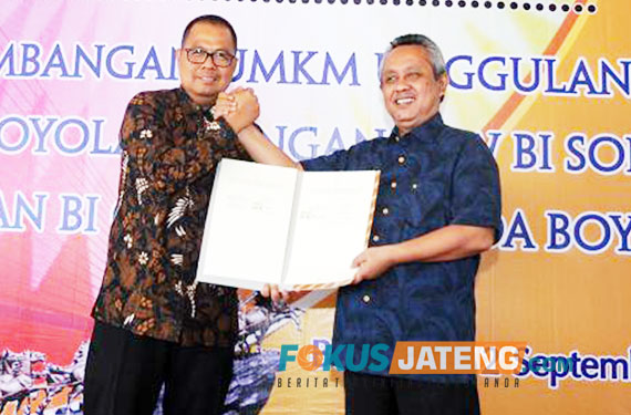 Bupati Boyolali Drs. Seno Samodro salam komando bersama Kepala Kantor Perwakilan Bank Indonesia (KPw BI) Solo Bandoe Widiarto dalam acara penyerahan BI Corner di Perpus Boyolali, Selasa 12 September 2017. (credit-Yulianto/Fokusjateng.com)