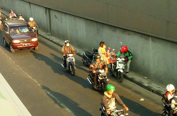 FOKUS JATENG – SUKOHARJO – Seorang warga mengabadikan aksi sosial seorang driver Go-Jek di Underpass Makamhaji, Kartasura, Sukoharjo, Jumat 15 September 2017. Si driver Go-Jek menolong seorang bapak mengendarai sepeda motor membawa kereta dorong bayi. Saat di perjalanan itu, di Underpass Makamhaji, kereta dorong bayi itu nyaris jatuh.