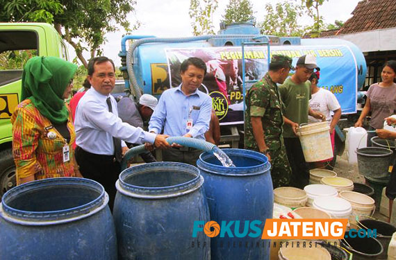 Warga Kecamatan Tangen semringah mendapat droping air bersih dari BKK Karangmalang, Selasa 26 September 2017. (credit-Huriyanto/Fokusjateng.com)