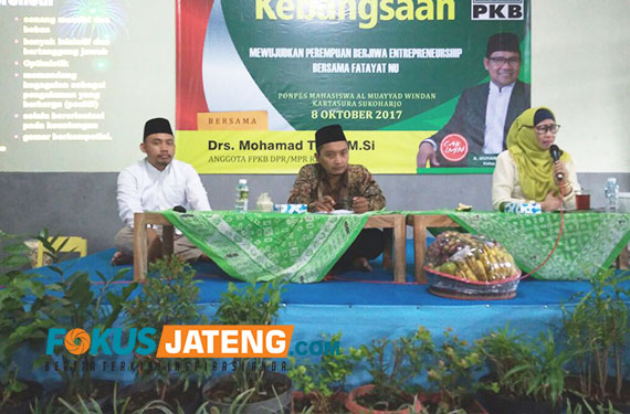FOKUS JATENG – SUKOHARJO – Partai Kebangkitan Bangsa (PKB) menggelar Halaqoh Kebangsaan di Pondok Pesantren (Ponpes) Mahasiswa Al Muayyad Windan, Kartasura, Sukoharjo, Minggu 8 Oktober 2017. Kegiatan dengan tema ”Mewujudkan Perempuan Berjiwa Entrepreneurship ini dihadiri 100 peserta. Mereka datang dari para Nyai dan Pengurus Fatayat NU dari Solo, Boyolali, Sukoharjo, dan Klaten.
