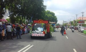 FOKUS JATENG-KARANGANYAR-Ribuan warga Karanganyar tumpah ruah di Jalan Lawu, Sabtu sore 11 November 2017. Mereka mengikuti kirab budaya dengan mengarak berbagai hasil bumi pertanian. Hasil bumi itu menjadi bahan asesoris dan ornamen modivikasi kendaraan.