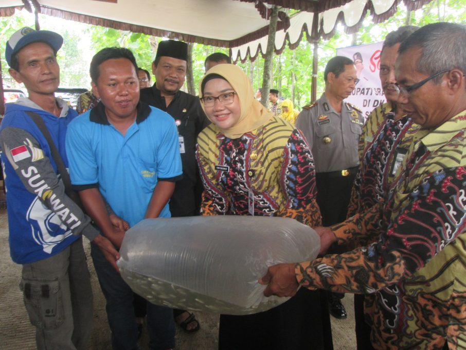 Bupati Sragen Kusdinar Untung Yuni Sukowati memberikan sambutan di hadapan warga sebelum penebaran bibit ikan di Dusun Duwet, Desa Ngandul, Kecamatan Sumberlawang, Sragen, Rabu 15 November 2017. (credit-Huriyanto/Fokusjateng.com)