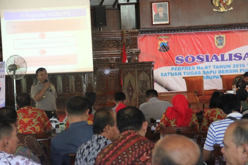 ”Yang diproses polres korupsi dana bantuan hewan ternak kambing kecamatan Jogonalan, sudah vonis 12 bulan. Korupsi alokasi dana desa Desa Sidorejo vonis 23 bulan. Pengadaan buku, BKK Kalikotes masing-masing sudah vonis. Dana bantuan desa Barukan kecamatan Manisrengo, korupsi OTT (operasi tangkap tangan) pungli Camat Manisrenggo masih P19, korupsi pengurusan prona masih proses pemberkasan,” kata dia dalam sosialisasi Perpres Nomor 87 Tahun 2016 tentang Satgas Saber Pungli di pendopo Pemkab Klaten, Selasa 14 November 2017.