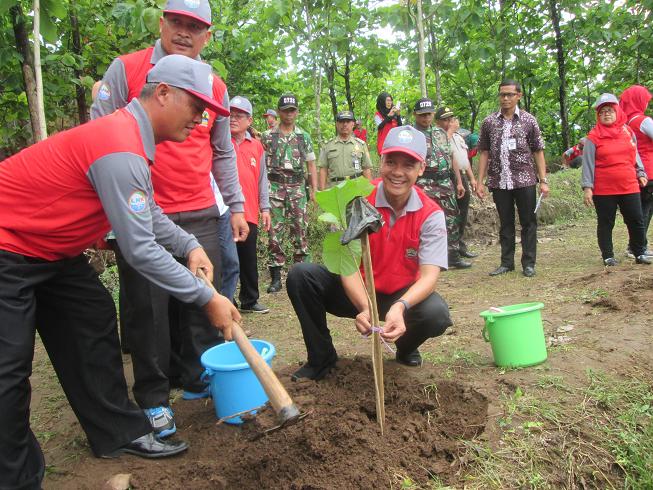 FOKUS JATENG-SRAGEN-Sebanyak 9.000 bibit pohon jati ditanam di wilayah Kecamatan Kalijambe, Sragen, Kamis 16 November 2017. Acara penghijuan di kawasan situs purbakala Sangiran ini dihadiri langsung Gubernur Jawa Tengah Ganjar Pranowo. Tanam pohon bersama warga dan penyuluh perhutanan tersebut dilakukan di sekitar menara pandang Sangiran.
