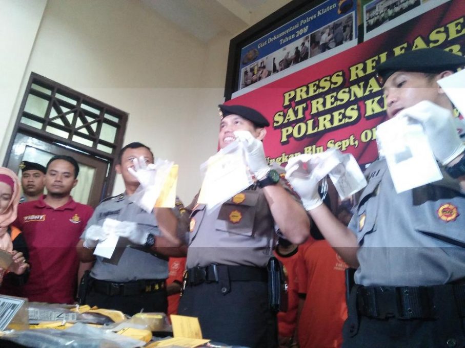 FOKUS JATENG-KLATEN-Satnarkoba Polres Klaten berhasil membekuk 12 pengedar dan pemakai narkoba Kamis 16 November 2017. Dari 12 tersangka, sembilan pelaku sekaligus pengedar diamankan di Mapolres Klaten. Sedangkan tiga tersangka dilakukan rehabilitasi di Rumah Sakit Jiwa Dr Soedjarwadi Klaten.