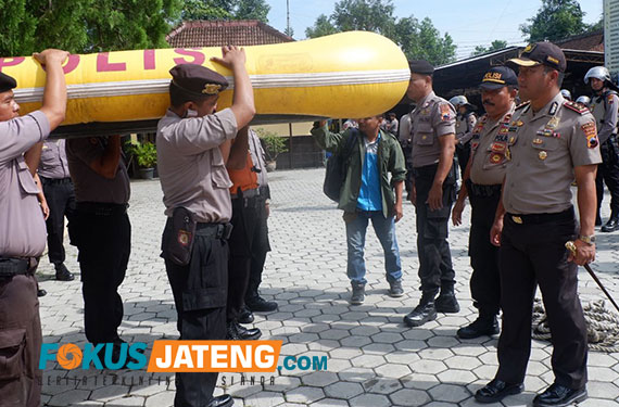 FOKUS JATENG – SRAGEN – Jajajaran Polres Sragen menyiapkan peralatan dan personel untuk penanganan bencana alam di musim hujan. Sebelum ditugaskan ke titik rawan banjir dan longsor, dilakukan pengecekan sarana dan prasaranan di halaman Mapolres Sragen, Kamis 30 November 2017.